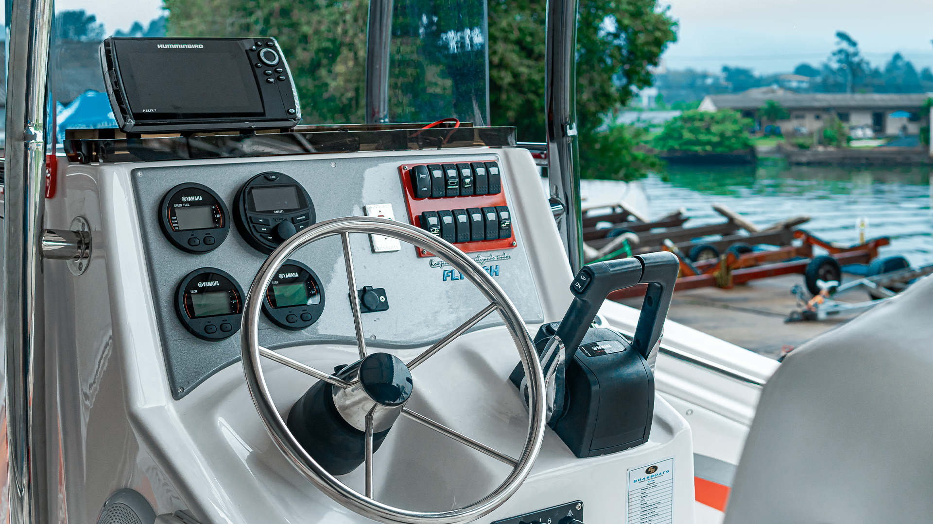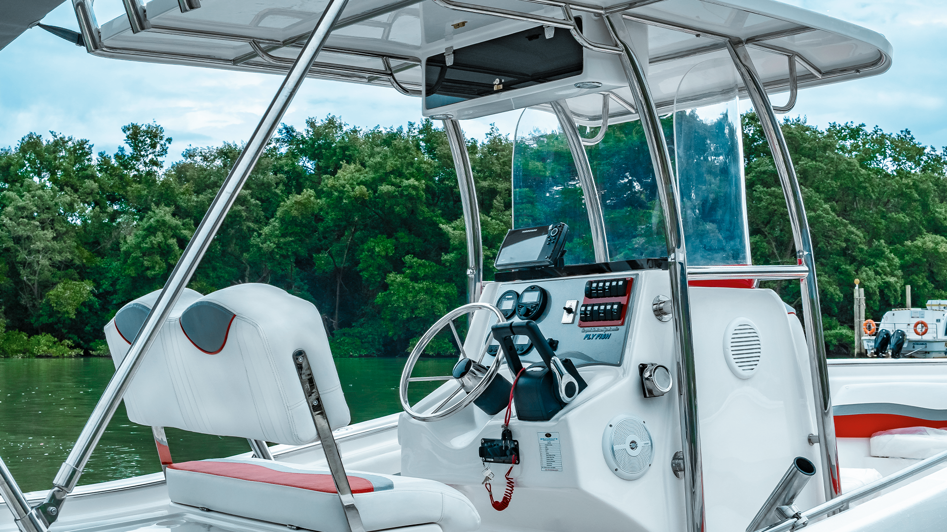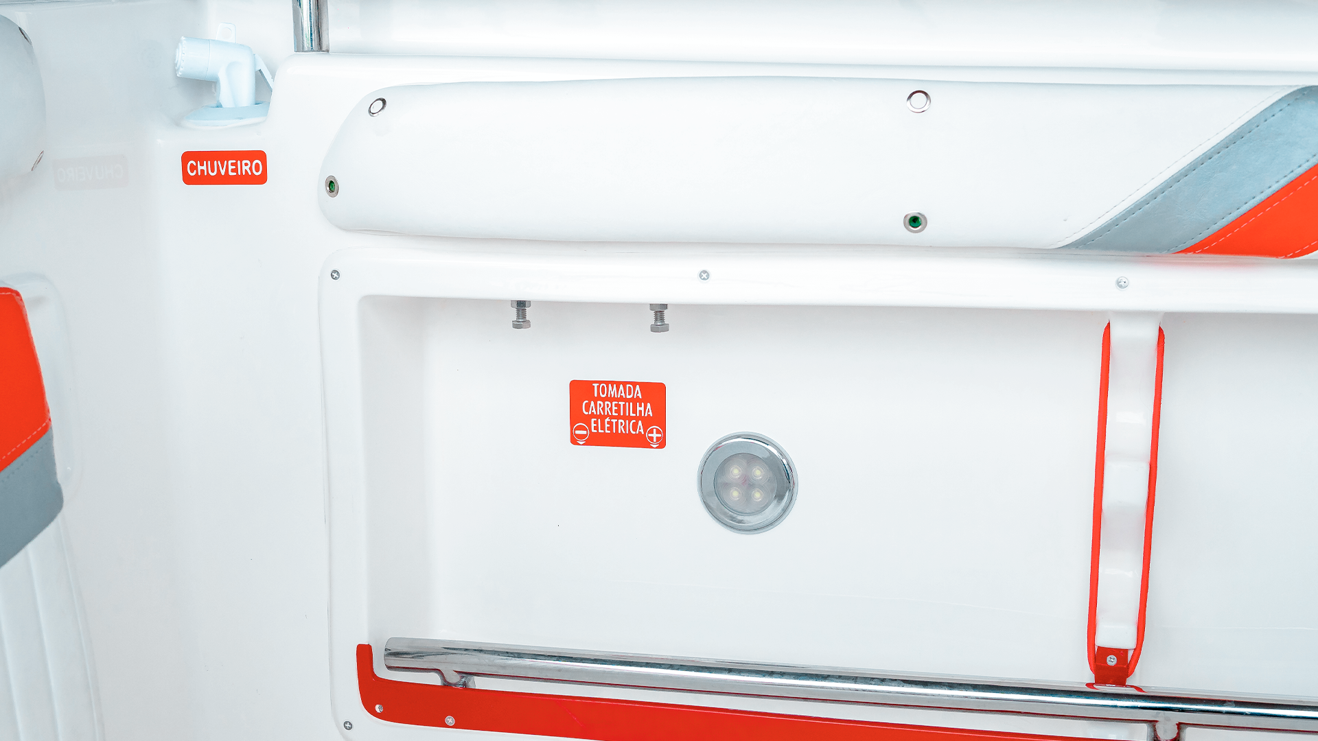 Caixa para peixes autodrenante com assento estofado na frente do painel;